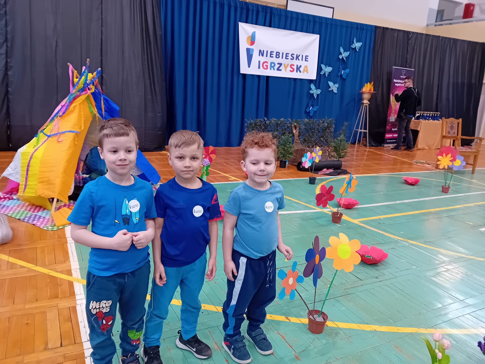 Dnia 9.04.2026 r. przedszkolaki z grupy „Plastusie” – Szymon, Sebastian i Nikodem - wzięły udział w „Niebieskich Igrzyskach” – ogólnopolskim wydarzeniu sportowo-edukacyjnym, mającym na celu zwiększanie świadomości na temat autyzmu oraz integrację dzieci poprzez wspólną zabawę i aktywność fizyczną. Wydarzenie zostało zorganizowane przez Publiczną Szkołę Podstawową z Oddziałami Mistrzostwa Sportowego nr 2 im. Jana Pawła II w Stalowej Woli. „Niebieskie Igrzyska” rozpoczęły się spektaklem teatralnym pt. „Niebieska niedźwiedzica”. Przedstawienie niosło ważne przesłanie – mimo różnic wszyscy powinni się integrować i wspólnie bawić. Podkreślono również, że dzieci z autyzmem oraz różnymi niepełnosprawnościami mogą aktywnie uczestniczyć w zajęciach sportowych i nie powinny być wykluczane. Na znak solidarności z osobami w spektrum autyzmu oraz ich rodzinami wszystkie dzieci ubrane były na niebiesko. Uroczyste otwarcie igrzysk uświetniło zapalenie znicza olimpijskiego oraz wspólne odśpiewanie hymnu. Następnie przedszkolaki brały udział w różnorodnych aktywnościach sportowych i rekreacyjnych. Każdy mógł znaleźć coś dla siebie – od malowania twarzy i zaplatania warkoczyków, po ścieżkę sensoryczną. Na zakończenie wszystkie dzieci otrzymały pamiątkowe medale. „Niebieskie Igrzyska” przebiegły w miłej i przyjaznej atmosferze, sprzyjającej integracji dzieci w różnym wieku. Serdecznie dziękujemy organizatorom za zaproszenie i możliwość udziału w tym wyjątkowym wydarzeniu.